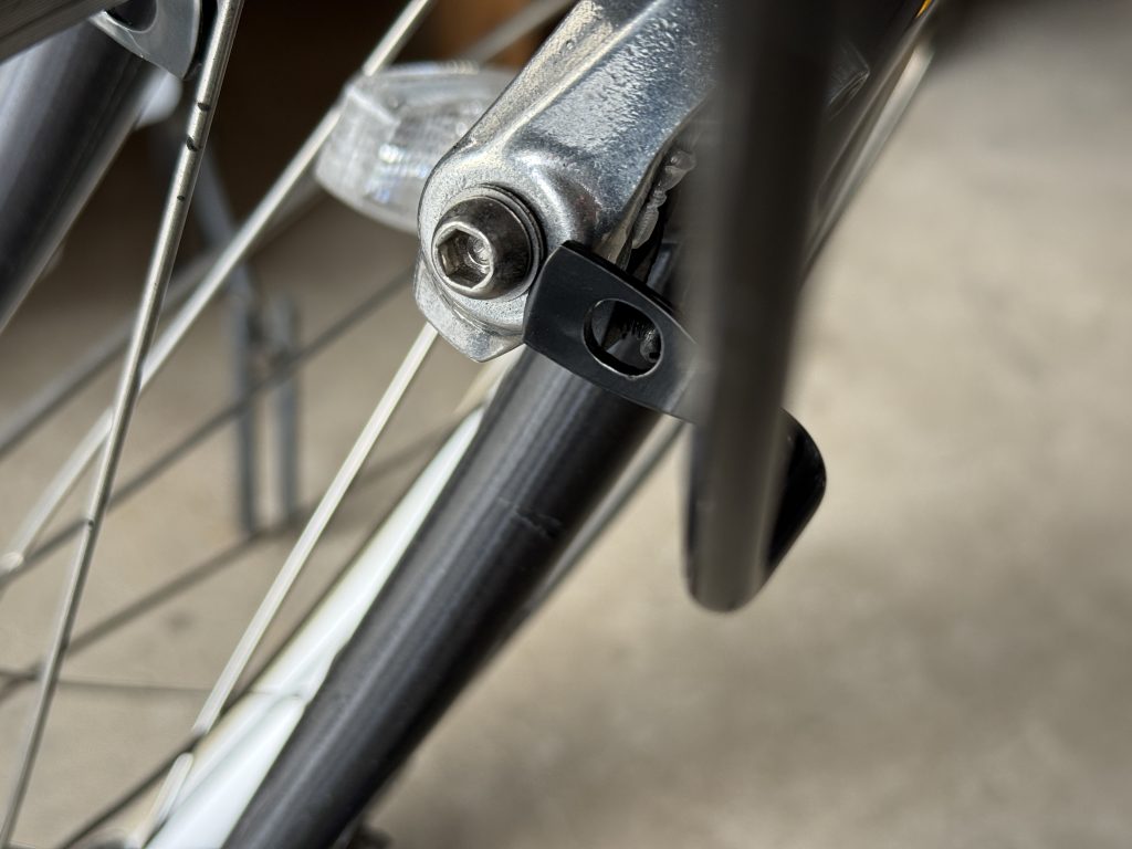 このカゴは、フロントフォーク1つとVブレーキ2つのネジ穴で支えているみたい。